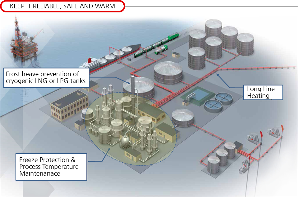Industrial longline heating is necessary to heat long pipelines, like transfer lines between processing plants or between storage or transportation facilities, for pipe freeze protection, condensation prevention, viscosity control, or temperature maintenance.