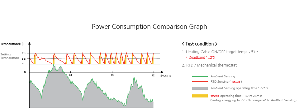 TESCON® System을 적용하였을 경우 대기온도와 관계없이 배관온도를 직접 측정,